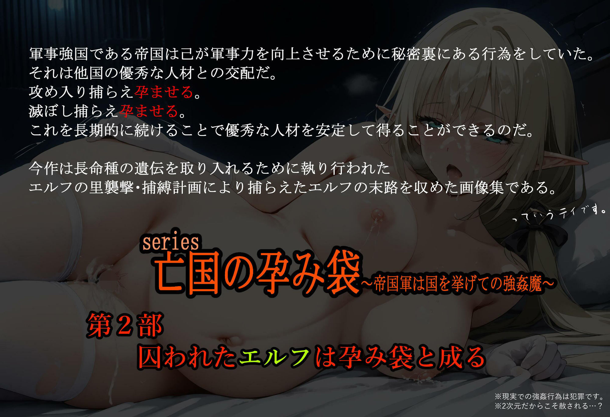 | 商品名 | 亡国の孕み袋 〜帝国軍は国を挙げての強●魔〜 第2部 囚われたエルフは孕み袋と成る |