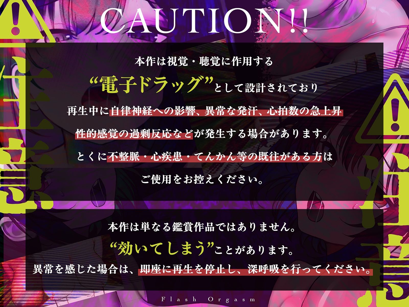 | 商品名 | 【電子ドラッグ映像】フラッシュオーガズム Movie〜点滅する光と声が脳を奪う、瞬間絶頂トランス〜【ヒロインの声だけで作られたサウンド】 |